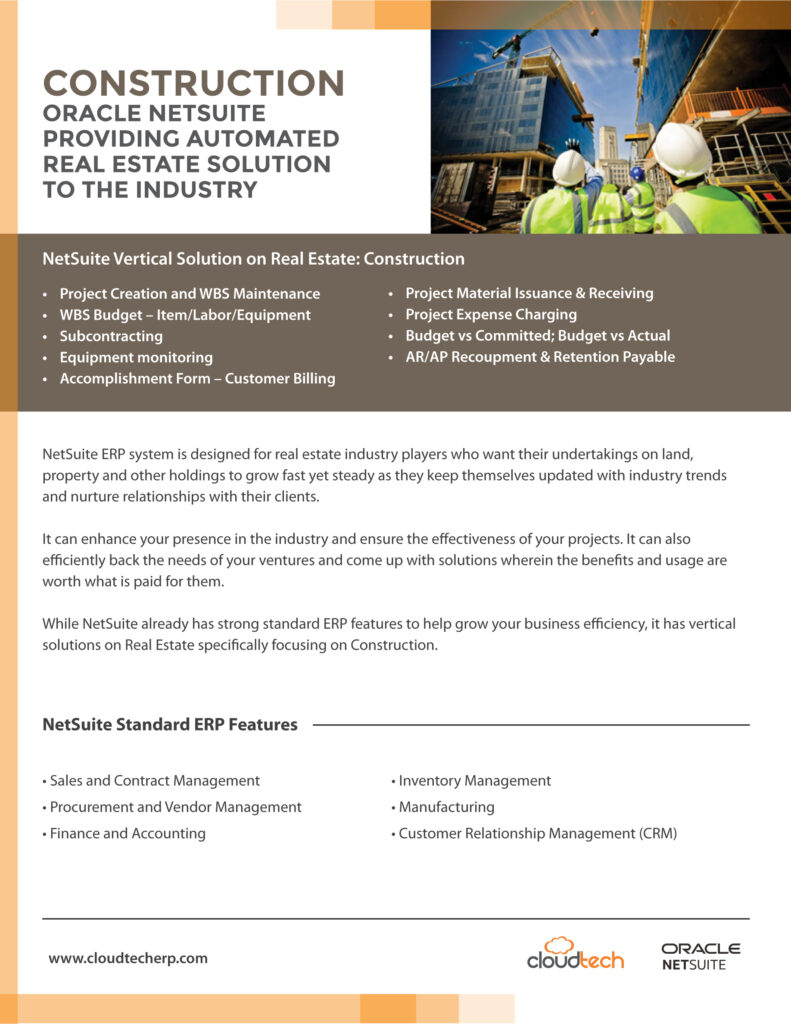 While NetSuite already has strong standard ERP features to hep grow your business efficiency, it has vertical solutions on Real Estate specifically focusing on Construction.